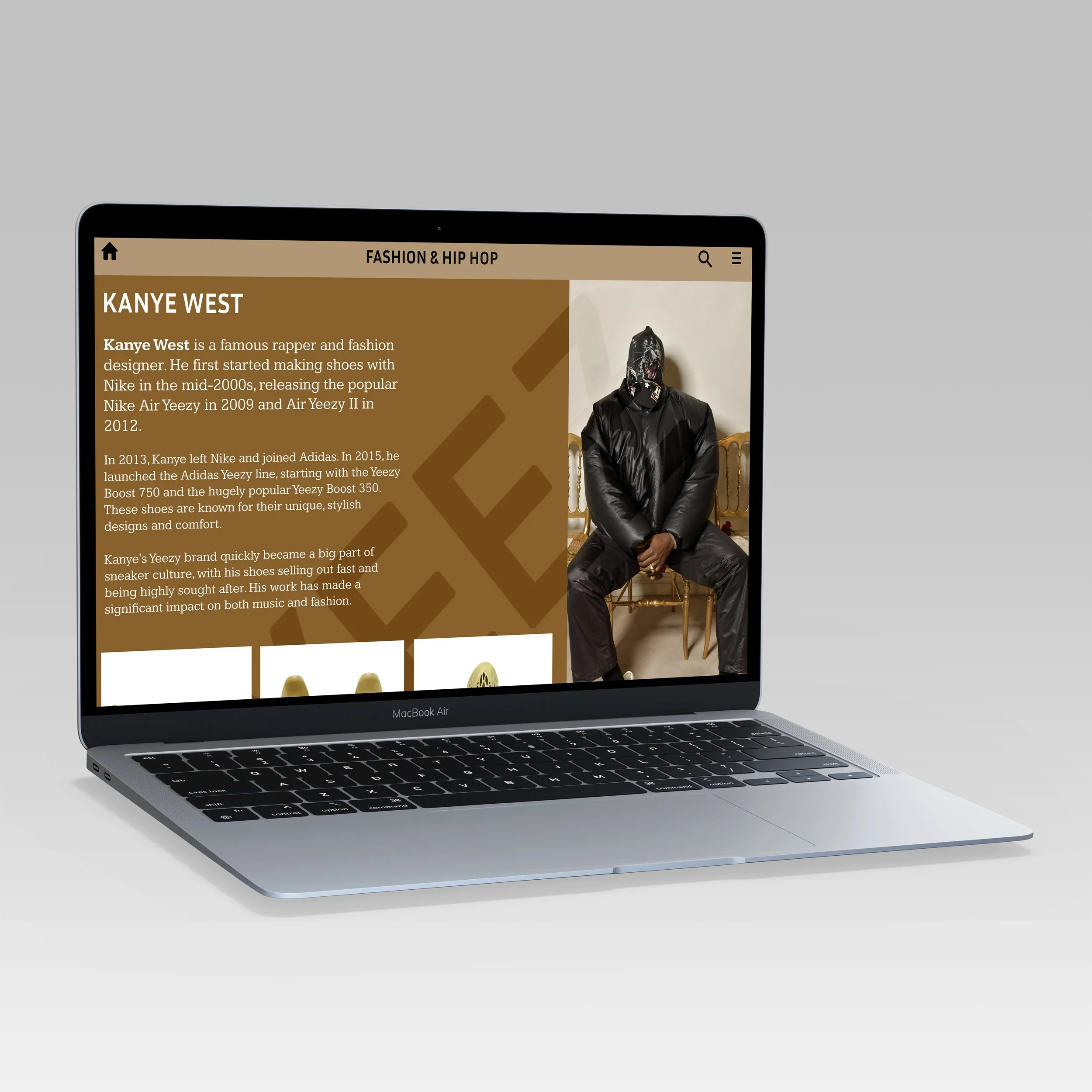 Designed with a bold, urban aesthetic, the interface combines high-contrast visuals, interactive sneaker galleries, and multimedia elements like music clips, videos, and behind-the-scenes design insights. Users can explore artist collaborations, signature sneaker models, release histories, and the cultural impact of each line. The platform celebrates creativity, entrepreneurship, and influence, showing how hip hop artists shape trends in both fashion and footwear while giving fans an engaging, visually-driven experience.